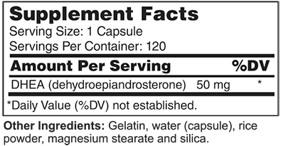 DHEA capsules contain highest purity dehydroepiandrosterone (DHEA) produced under strict Good Manufacturing Practices (GMP) standards. This formula supplies 50 mg of DHEA per capsule.