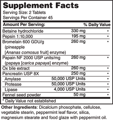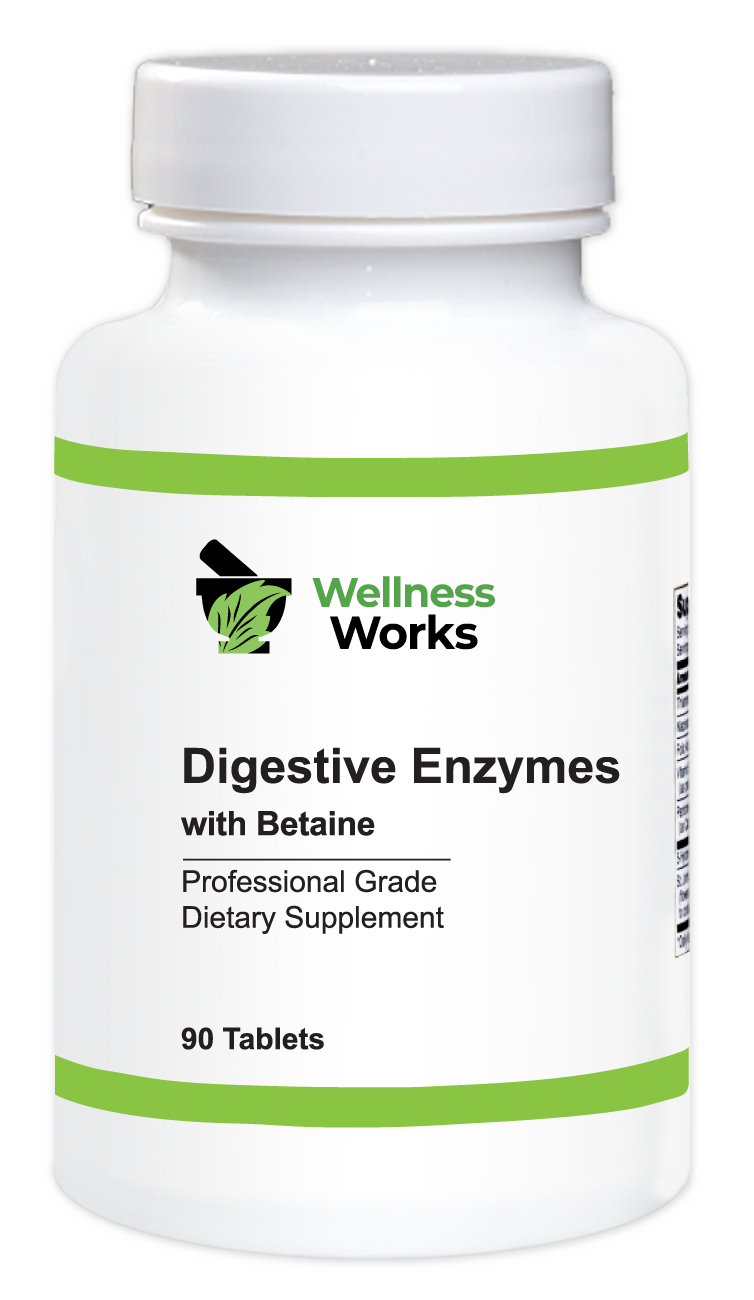 Digestive Enzymes with Betaine is a natural dietary digestive supplement specifically formulated with bile, active digestive enzymes, and betaine which acts synergistically to assist in the healthy functioning of fat, protein, and carbohydrate digestion.