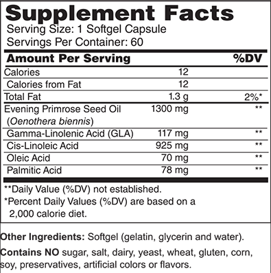 Evening Primrose Oil is an excellent source of the important gamma-linolenic acid (GLA) providing 117 mg of GLA per softgel. This Evening Primrose Oil formulation is 100% pure cold expeller pressed and hexane free. It is derived from the seeds of the evening primrose, a high quality source of gamma-linolenic acid.