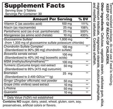 Joint Health Support is a superior formula designed for supporting joint and connective tissue health. It contains 1000 mg of fully reacted glucosamine sulfate along with chondroitin complex, both well known for their cartilage supporting properties. Boswellia, turmeric and bromelain provide additional antiinflammatory benefits to the joints. Several other key nutrients including MSM round out this high powered formula. MSM is a potent source of organic sulfur which plays a crucial part in proper collagen and cartilage formation for healthy pain-free bones and joints.