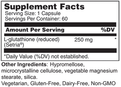L-Glutathione Reduced 250 mg supports the body’s natural defense system with patented Setria® glutathione to support healthy immune function, promote detoxification, and encourage healthy oxidative stress response. Data Sheet: 10389 L-Glutathione Reduced