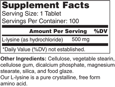 L-Lysine is an amino acid which provides nutritional support for the body’s natural defenses. L-Lysine is particularly helpful in maintaining healthy gum, lip and skin tissue. Each tablet contains 500mg of the amino acid.