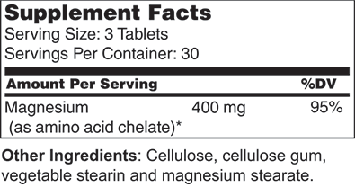 Magnesium Chelate 400 mg is a nutritionally functional magnesium amino acid chelate with excellent bioavailability. Each tablet delivers 133 mg of elemental magnesium as a bis-glycinate/lysinate chelate, or 400 mg per 3 tablet serving.