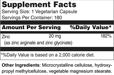 Zinc Chelate 20 mg is a highly bioavailable zinc supplement featuring chelated zinc arginate and zinc glycinate. The chelation process bonds zinc with amino acids to enhance absorption and make the product easier on the gastrointestinal tract.